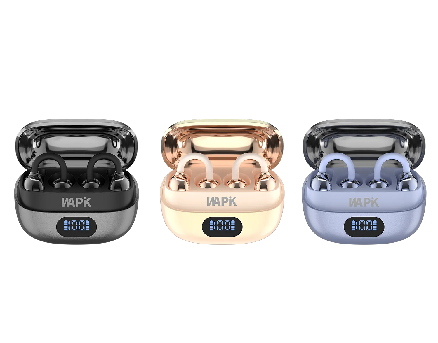WAPIK推出的这款尖端耳夹式耳机采用蓝牙6.0技术!耳机仅重3克,超轻便携,长时间佩戴也舒适无比。耳机采用时尚的缎带设计,ENC主动降噪功能确保通话清晰,播放时间长达50小时,并具备防水防尘功能,是通勤、运动或馈赠亲友的理想之选。