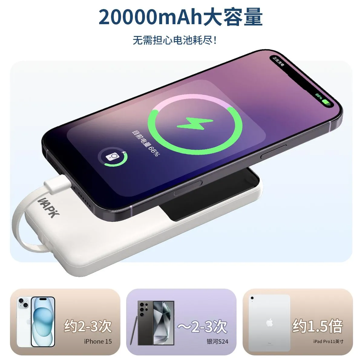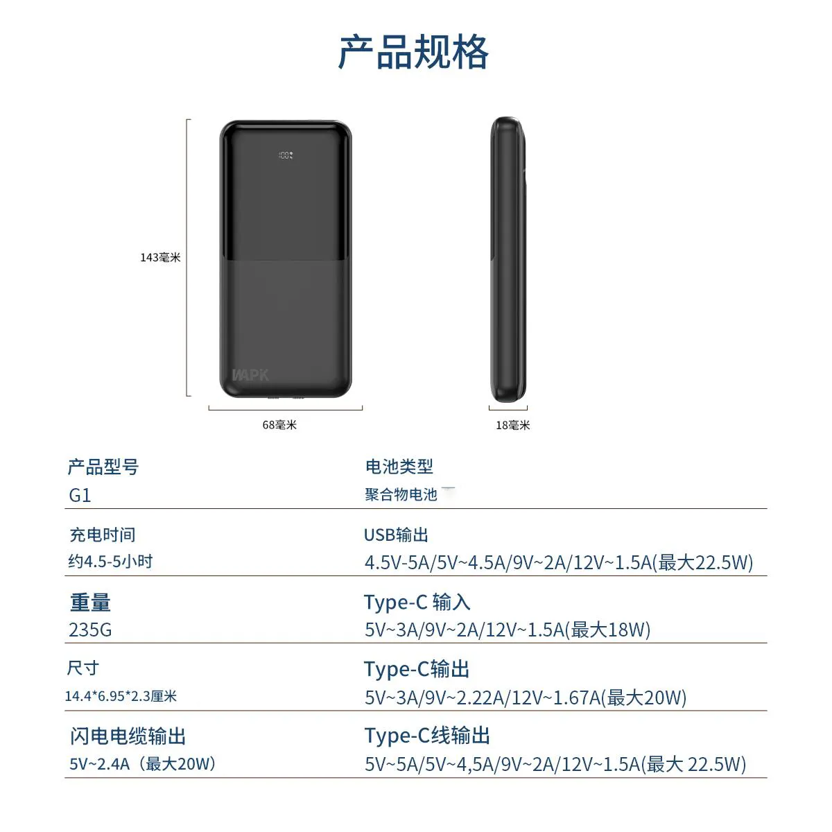 22.5W 极速快充,充电速度 “咻” 一下就上去,再也不用苦苦等待。20000mAh 超大容量,出门在外,手机、平板想充就充,再也不怕电量告急。