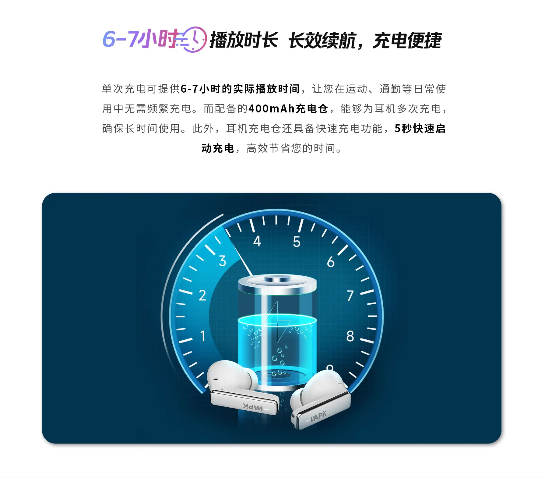 音质和实用性也没妥协:高清动圈单元还原细腻音效,不管是流行乐的节奏还是 podcasts 的人声,都清晰通透;蓝牙 5.3 连接稳、响应快,10 米内走动能保持连贯,不会突然断连;单次充电能用 6 小时,搭配充电盒总续航达 24 小时,日常通勤一周充一次就够。还有触控操作切歌、接电话,不用掏手机也能轻松搞定,生活中的每段碎片时间,都能有流畅音乐相伴。