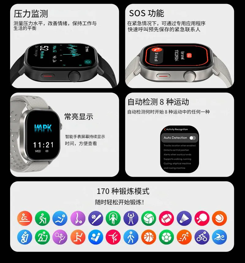 压力山大时,它的压力监测功能能帮你实时掌握压力水平,就像个贴心的情绪管家,让你及时调整状态,平衡工作与生活。遇到紧急情况也别慌,SOS 功能能通过专用程序快速呼叫紧急联系人,给你满满的安全感。
